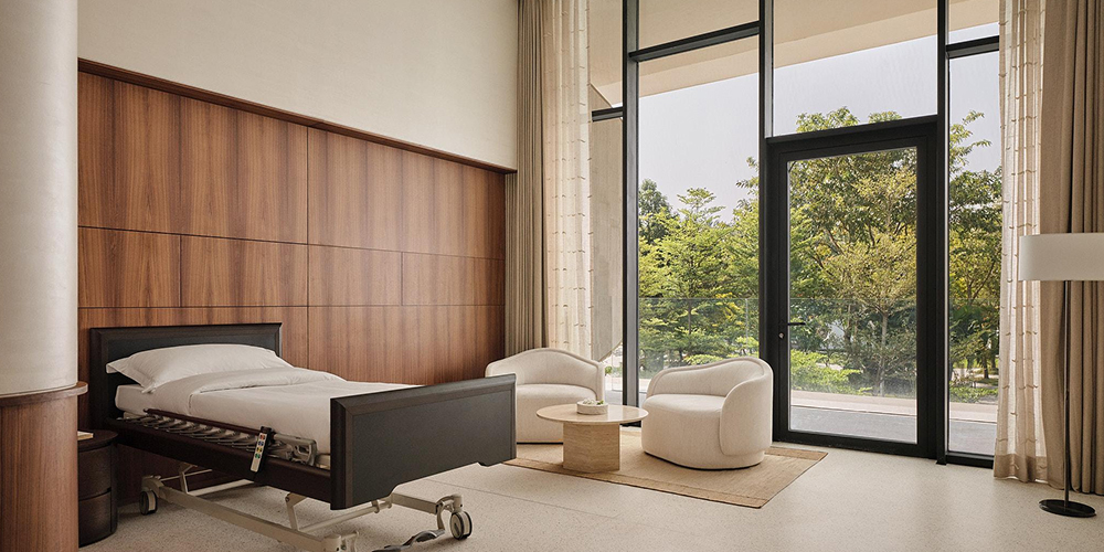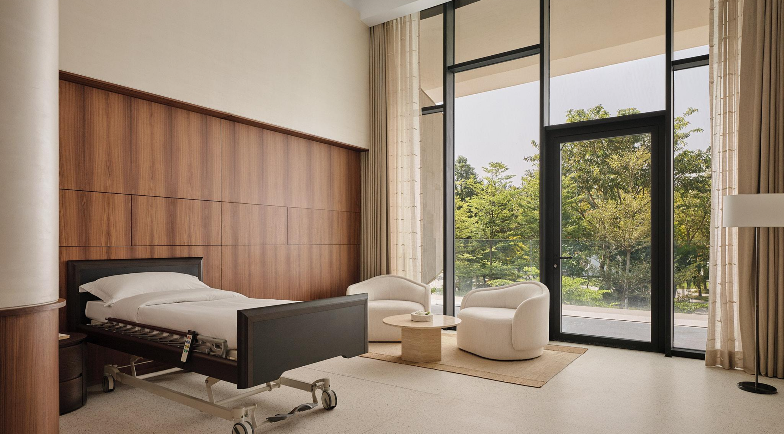 A serene medical room designed for comfort and care, featuring warm wood paneling, soft neutral tones, and a clinical bed integrated into a calm, residential setting. An intuitive bed tracks vitals and recovery, with smart panels for oxygen and IV drips, and a dedicated nurse on call 24/7.