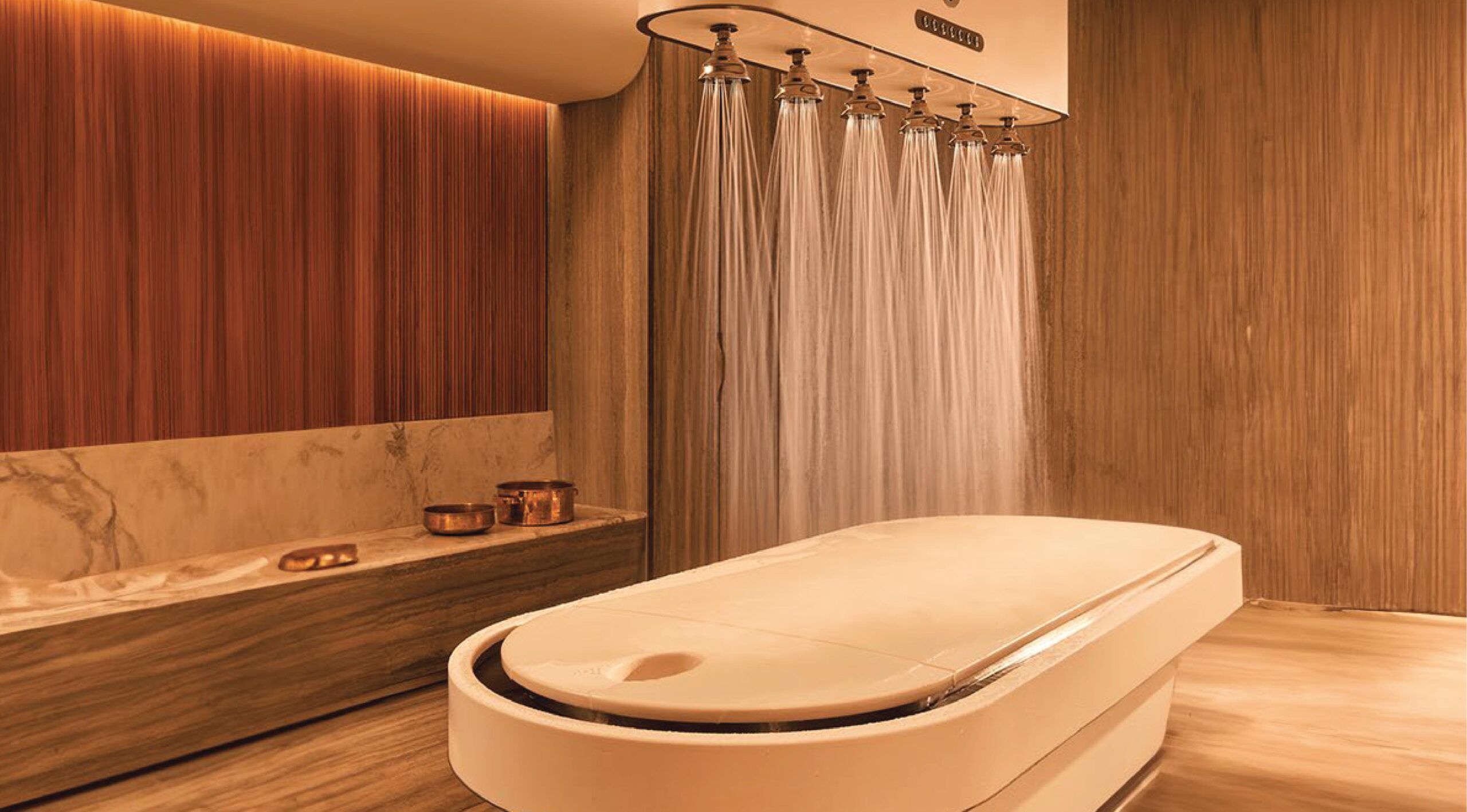 The integrated treatment platform and water cascade support both physiological and experiential benefits.